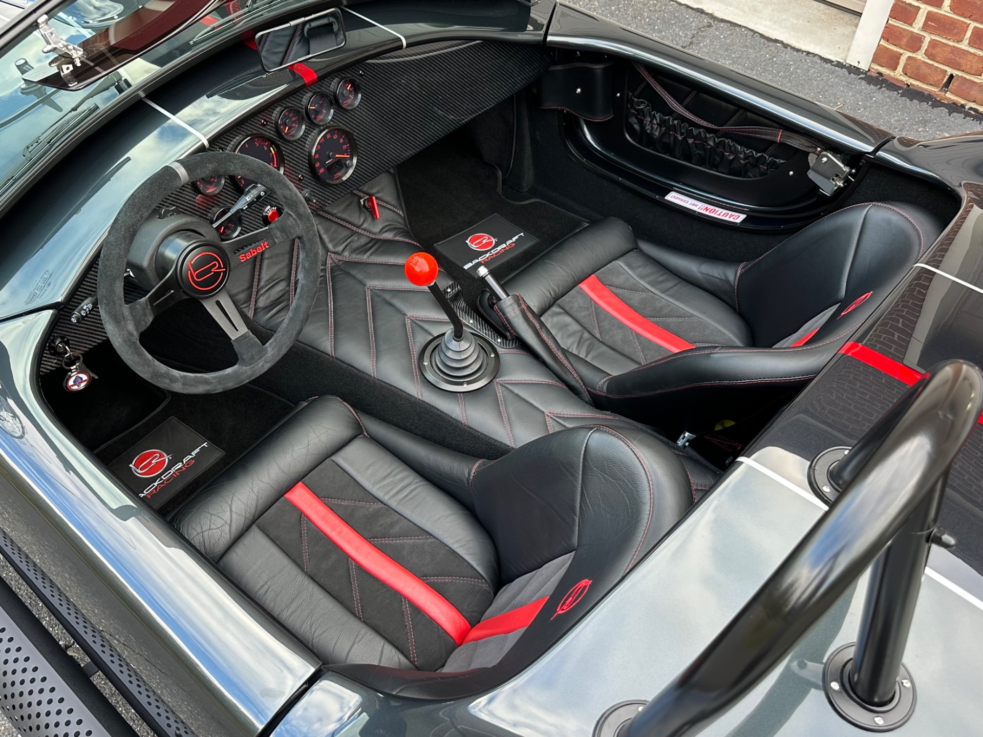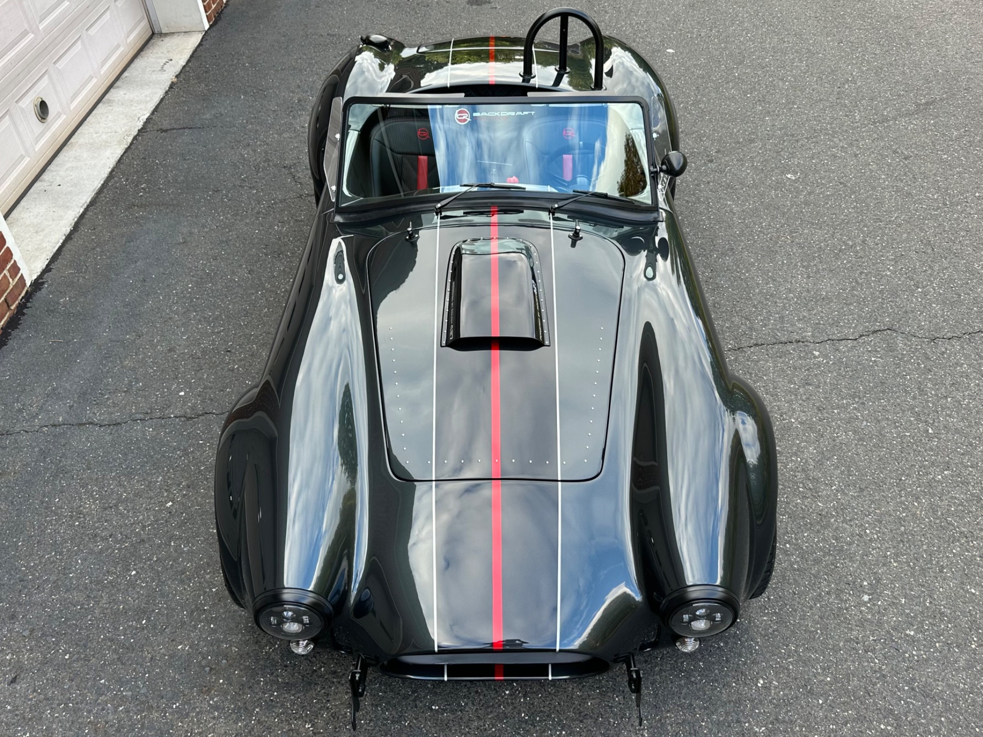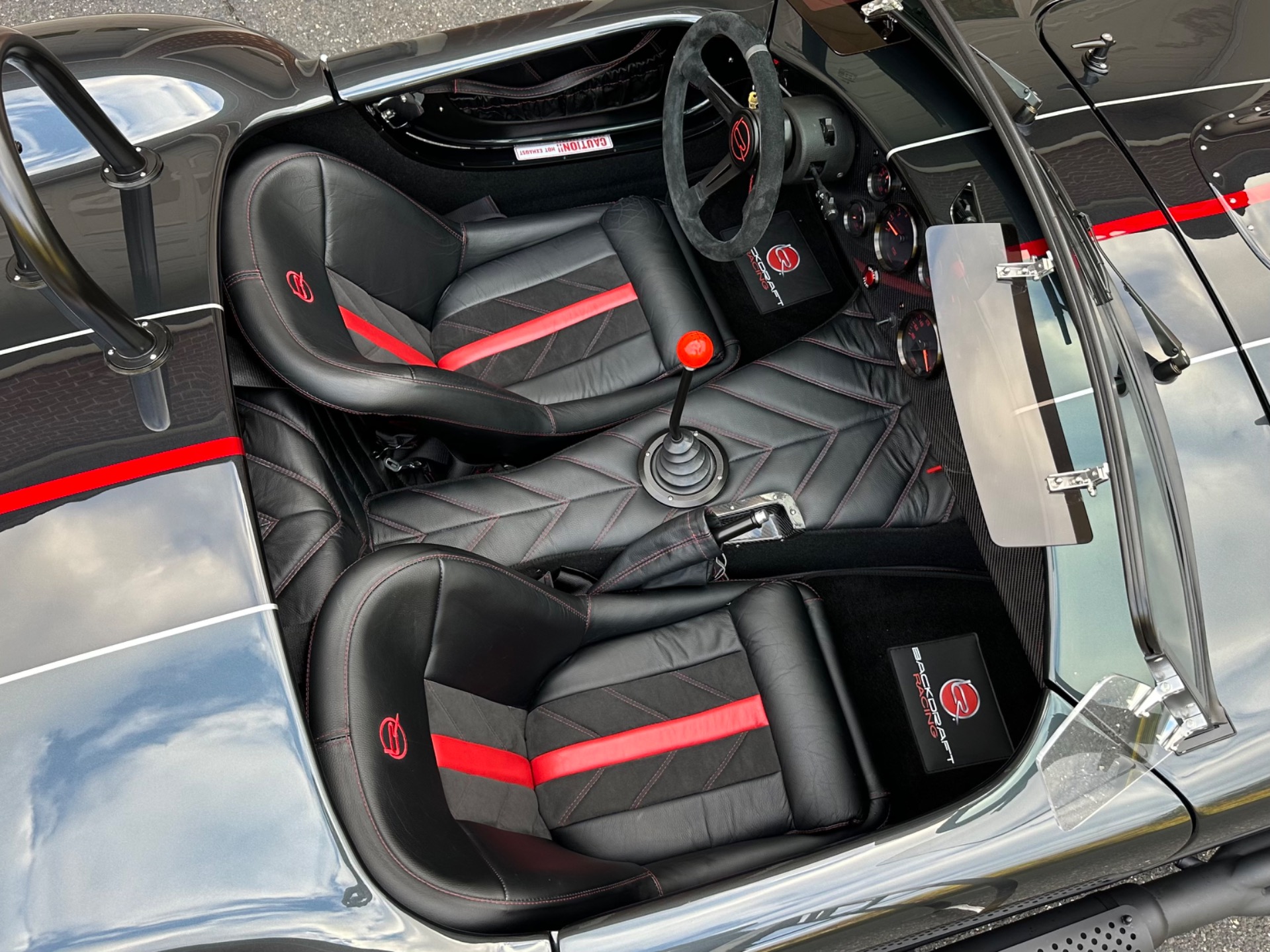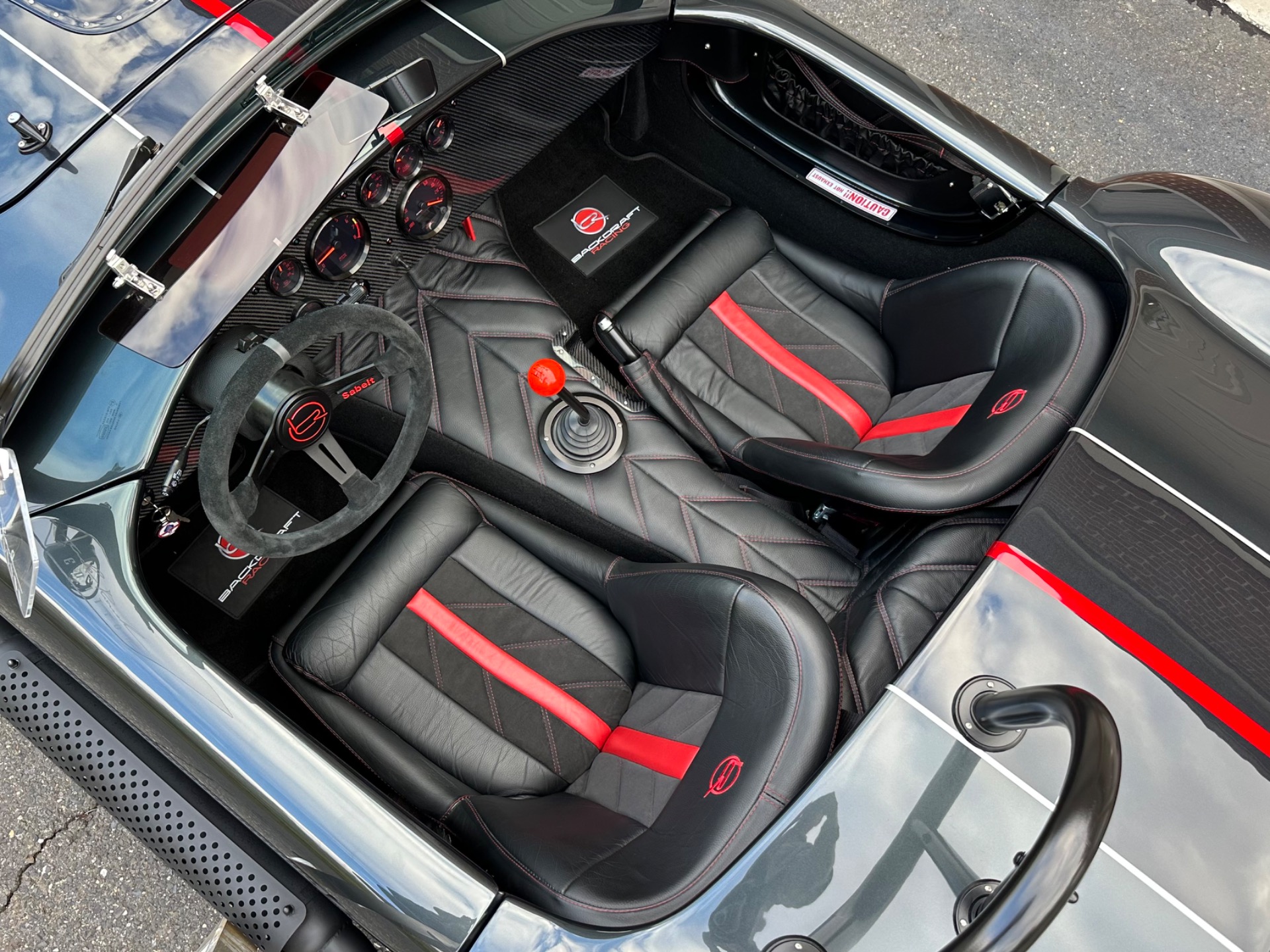 1965 Backdraft Racing Cobra Carbon Steel Gray Metallic Roush 427R. A brand new arrival at Jonathan Motorcars, this 1965 Backdraft Racing Cobra is a stunning tribute to the original 1965 Shelby Cobra reimagined with modern performance, premium materials, and a one-of-a-kind color combination. Finished in Carbon Steel Gray Metallic with Volcano Black stripes and a striking Soul Red center stripe, this Cobra is among the first we've delivered in this bold, high-contrast configuration. Inside, the cockpit features black leather with red contrast stitching, Alcantara seat inserts, and unique diagonal seat patterns with a rear stitched panel giving the interior a custom-finished look. Under the hood, the legendary Roush 427R V8 delivers over 550 horsepower, mated to a Tremec 5-speed TRX manual transmission for an authentic, analog driving experience. The sound, feel, and power delivery are exactly what you'd expect from a hand-built American icon refined by modern engineering. Upgraded options include power steering, an oil cooler, blacked-out LED headlights, cam lock style seat belts, Speedhut gauges, a suede Sabelt steering wheel, custom shift knob, Raydot mirror, aluminum gas tank, carbon fiber e-brake recess, clutch and brake fluid remote reservoirs, and black engine cladding. The GT body and clear film paint protection finish off the exterior with both style and durability, while a gray-coated frame adds a clean, modern touch underneath. Jonathan Motorcars has proudly been an official Backdraft Racing dealer for over 13 years and is now the highest volume dealer in the USA. Each Cobra we deliver undergoes a meticulous quality assurance process to ensure it's nothing short of perfect when it arrives at your door. We offer global shipping and financing options to make your dream Cobra a reality. Own a piece of American automotive history built with precision, delivered with passion. Buy with confidence from JMC.