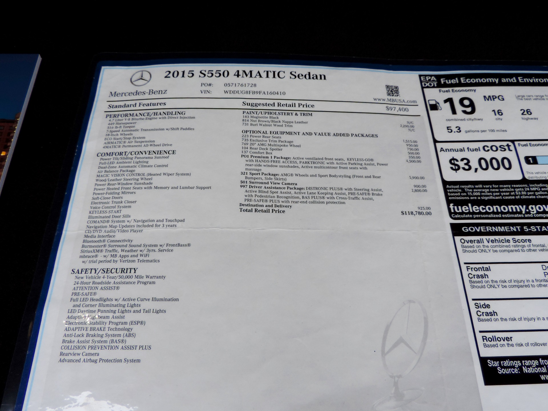 Jonathan Motorcars is Very Proud To Offer This Beautiful 2015 Mercedes S550 4-Matic Sport Edition in Magnetic Black over Nut Brown/Black Nappa Leather and Burl Walnut Wood Trim with Options Such As P01 Premium 1 Package ($4500) (Active Ventilated Front Seats, Keyless Go with Hands Free Access, Parktronic with Active Parking Assist, Power Rear Side Window Sunshades, Active Multicontour Front Seats with Massage)- Sport Package ($5900) (AMG Wheels and Sport Bodystyling, Front and Rear Bumpers and Side Skirts)- Surround View Camera ($900)- Driver Assistance Package ($2800) (Distronic Plus with Steering Assist, Active Blind Spot Assist, Active Lane Keeping Assist, Pre Safe Brake with Pedestrian Recognition, BAS Plus with Cross Traffic Assist, Pre Safe Plus with Rear End Collision Protection- ECO Start/Stop System- Airmatic Suspension- Panoramic Sunroof- Full LED Ambient Lighting- Dual Zone Automatic Climate Control- Air Balance Package- Magic Bision Control- Heated Wiper System- Power Rear Window Sunshade- Power Heated Front Seats with Memory and Lumbar Support- Power Folding Mirrors- Soft Close Doors- Electronic Trunk Closer- Voice Control System- Keyless Start- Illuminated Door Sills- Comand System w/Navigation and Touchpad- Navigation Map Updates- Bluetooth Connectivity- Burmester Surround Sound w/Front Bass- Sirius XM w/Traffic, Weather-  Attention Assist- Full LED Headlights w/Active Curve Illumination and Cornering Illumination Lights- LED Daytime Running Lights and Tail Lights- Adaptive Highbeam Assist- Electronic Stability Control- Adaptive Brake Technology- Anti Lock Braking System (ABS)- Brake Assist System- Collision Prevention Assist Plus- Rearview Camera- Clean Carfax- One Previous Owner- Fully Serviced- Needs Nothing- Remaining Balance of the Factory Warranty. Original MSRP of $118,780.00
